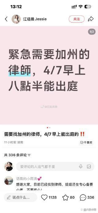 正是这段刚刚结束的婚姻,在江语晨复出之际给了她沉重一击。2026年4月7日凌晨,当大多数参赛姐姐们正在为小考做最后准备时,江语晨却在社交媒体上发出了紧急求助:“需要找加州的律师,4/7早上能出庭的,紧急需要加州的律师,4月7日早上八点半能出庭。”